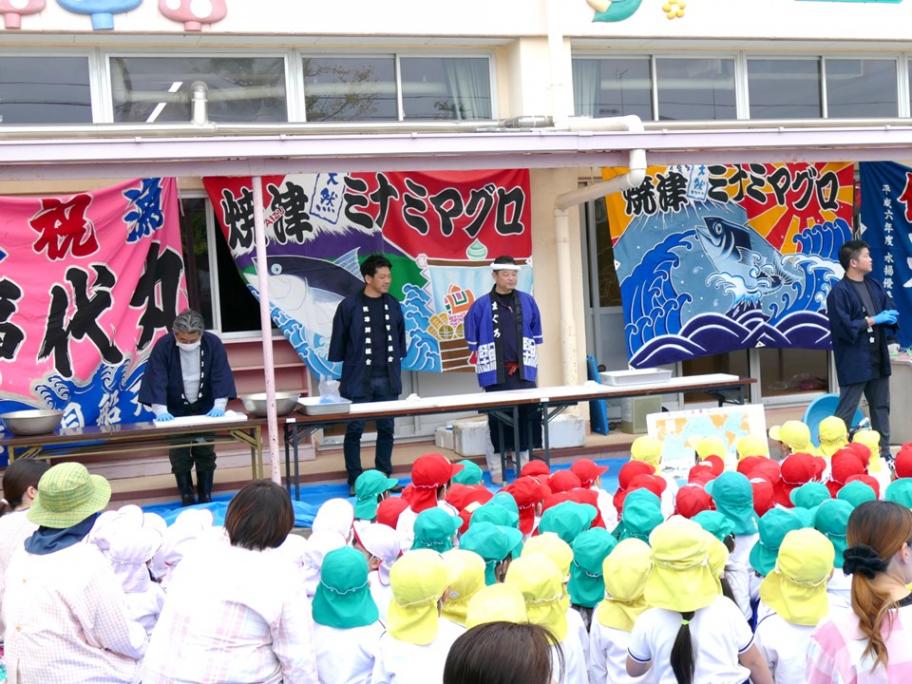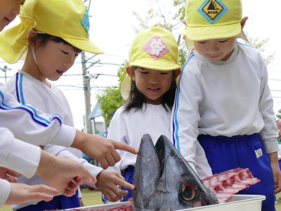 2025年11月5日水曜日、焼津豊田幼稚園で園児の魚食定着を目的とした「マグロ解体ショー」が行われました。職人がマグロの生態や漁法を説明後、天然ミナミマグロが登場すると園児からは歓声が上がり、素早い手さばきでマグロを解体する姿に、目を輝かせていました。