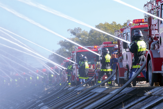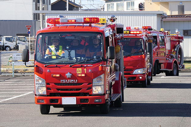 焼津文化会館では、永年勤続団員などを表彰する式典と、消防車両・消防団員による分列行進を実施。その後、瀬戸川右岸緑地公園に移り、消防団車両19台による一斉放水が行われました。見学に訪れた市民から歓声が上がり、焼津市の安心・安全な一年を祈念しました。