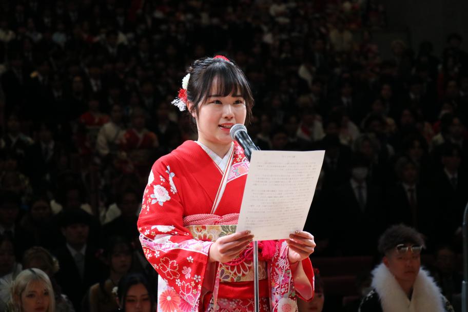 式典では、はたちを代表して亀山杏佳(かめやま きょうか)さんが「今日まで私たちを支え、見守ってくださった全ての方々に、心より感謝申し上げます。ここに集う仲間たちは、進む道は異なっても、同じ時代を、同じ空の下で生きる仲間として、今日ここに顔をそろえることができました。今日この瞬間の喜びと、これまでの全ての経験を胸に、私たちは未来に向かって自信を持って歩み出します」と、誓いの言葉を述べました。