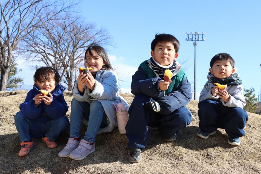 子どもたちは出来たての焼きいもを口いっぱいに頬張ると、「ほくほくだね」「甘くておいしいね」と声を上げ、満面の笑みを浮かべていました。