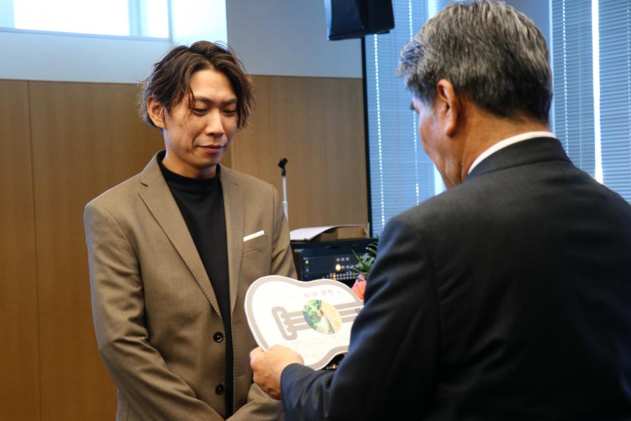 中野市長から特製の任命証を手渡される松田さん