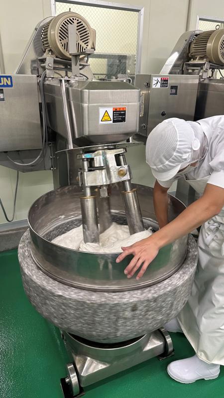 もう一つのポイントは、石臼製法です。石臼でゆっくり丁寧に白身魚をすりつぶす事でしっとり感が出ます。大手メーカーが使うサイレントカッターと発泡機だとフワフワ感は出ますが、きめ細かいしっとり感は石臼製法だから出せるものです。