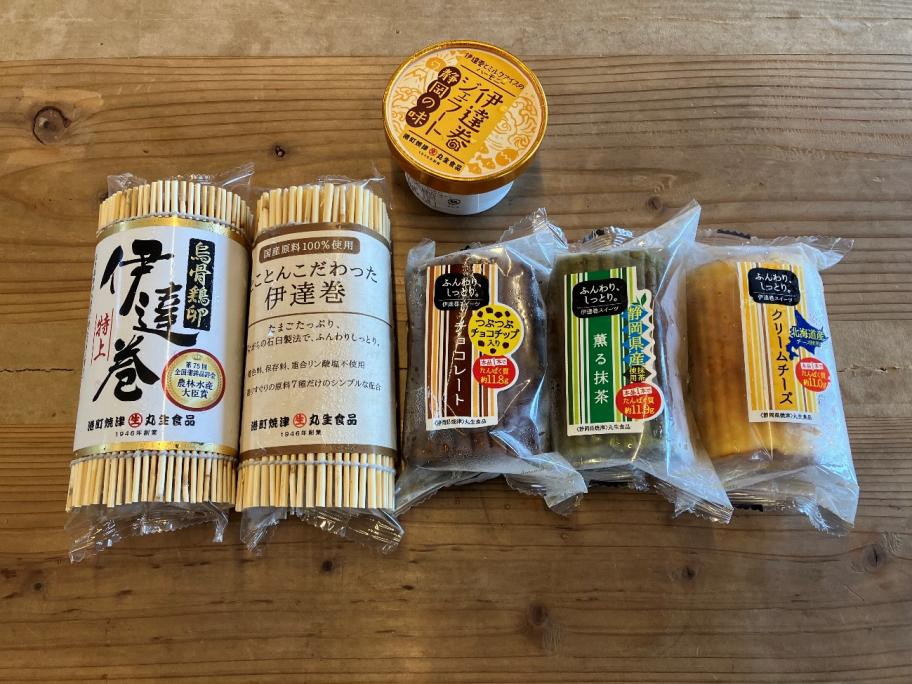 オリジナル商品の一つ、伊達巻スイーツは焼津市が食品会社の新商品開発を支援する「ネオ焼津プロジェクト」をきっかけに開発しました。クリームチーズ、チョコレート、静岡抹茶と3種類の味があります。開発する上で「伊達巻の形状を変える」という案も出ましたが、形状は変えないようにしました。「ケーキやコンビニスイーツと戦うのではなく、伊達巻で勝負したい」との思いがあったからです。
