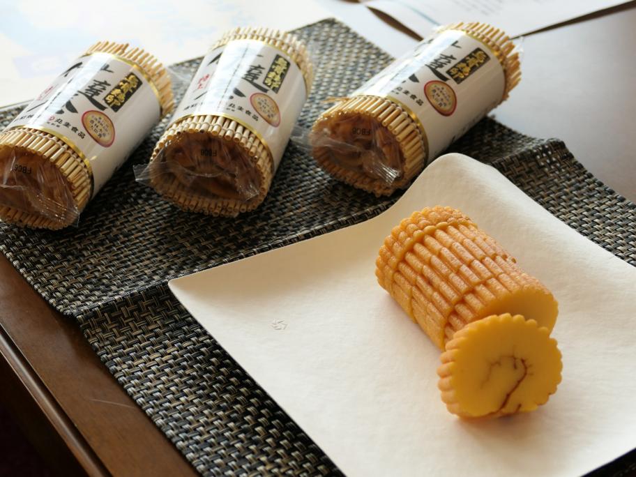 「特上 烏骨鶏卵伊達巻」は烏骨鶏卵や和三盆糖、米粉でんぷん、海洋深層水など上質な原料を揃えて作りました。解凍後のパサつきがなく、しっとり感があるのが特徴です。2024年に全国蒲鉾品評会で農林水産大臣賞を受賞しました。